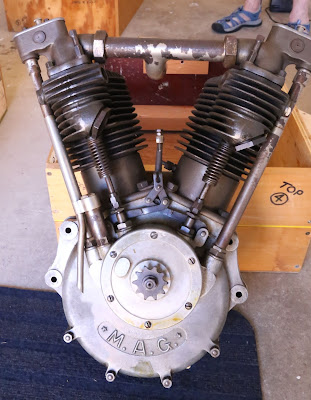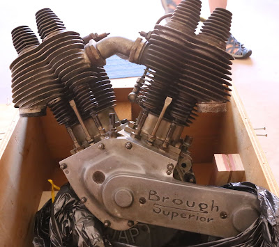 We were surprised to find two SS100 Alpine Grand Sports and a 680 OHV "swing arm" form of Brough and neatly made boxes, seven in all, with "V" twin engines in them.... three for the bikes and the others, a 1000cc Swiss MAG/Motosacoche and three 1000cc JAPs...